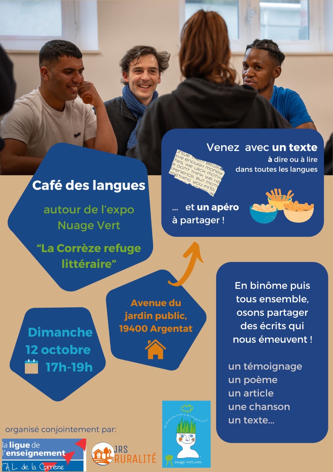 – Le dimanche 12 octobre, visite à 16h30 de l’exposition avec Gauthier Azou puis CAFÉ DES LANGUES de 17h à 19h devant Nuage Vert au jardin public d’Argentat-sur-Dordogne en partenariat avec la Ligue de l’Enseignement (FAL 19) et JRS Ruralité