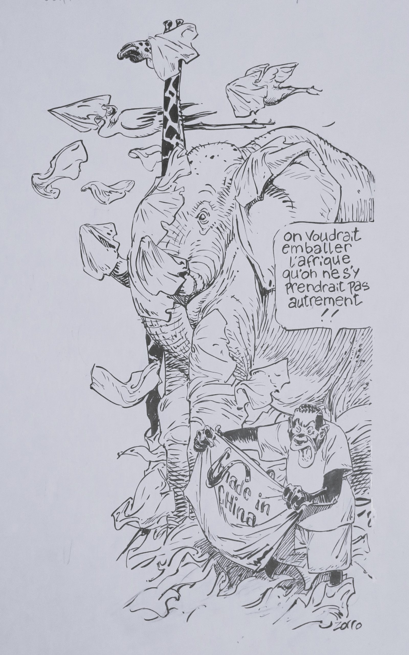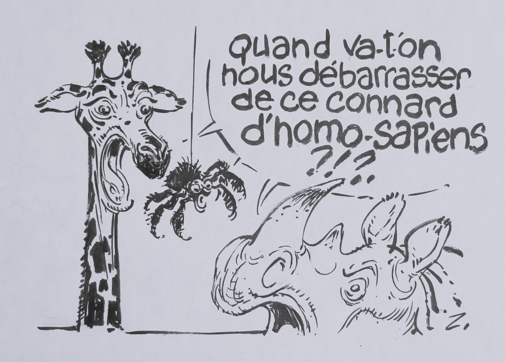 Ces dessins à l’encre de Chine sur papier sont de ZORRO (ou François Boucq), grand prix d’Angoulême. Cet artiste –très important dessinateur virtuose (à l’instar d’un Jean Giraud/Moebius ou d’un Cabu)– a exposé à Nuage Vert et donné un ensemble d’originaux en 2020 sur les thèmes environnementaux