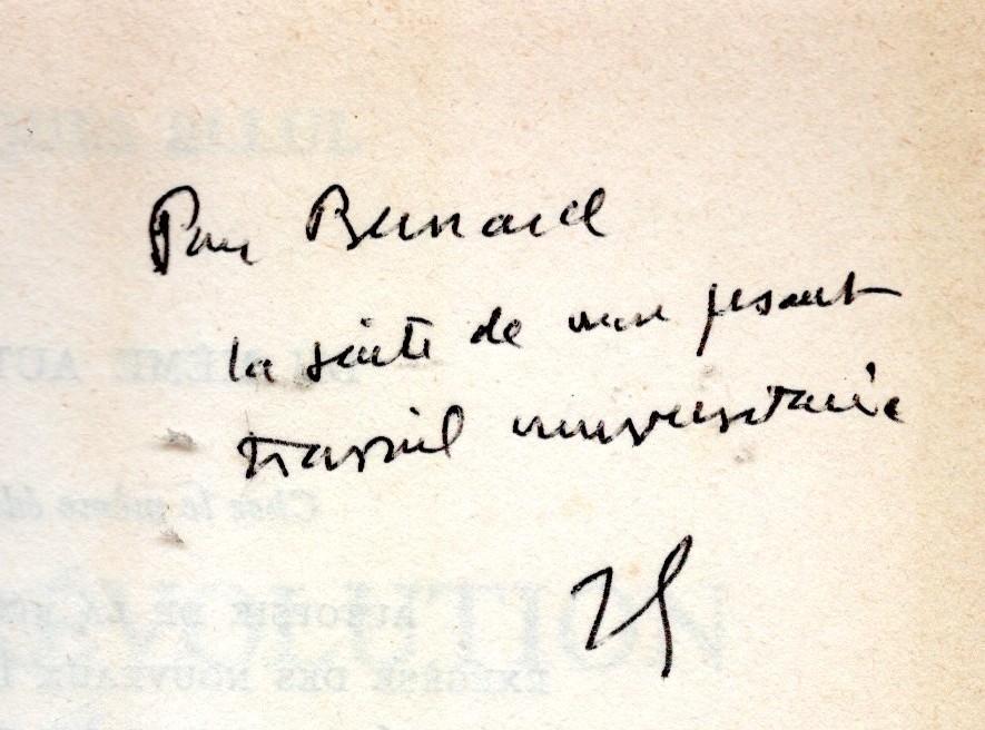 Ce détail manuscrit d’André Malraux appartient aux collections de Nuage Vert. Il est un clin d’oeil aux Rencontres-Promenades « Histoires de Passages » qui lui ont rendu hommage. Malraux se réfugia en effet avec Josette Clotis pendant la guerre à Saint-Chamant près d’Argentat où demeuraient Emmanuel Berl et son épouse Mireille. Il s’agit de la dédicace en 1975 d’Hôtes de passage à François Nourissier et à son épouse