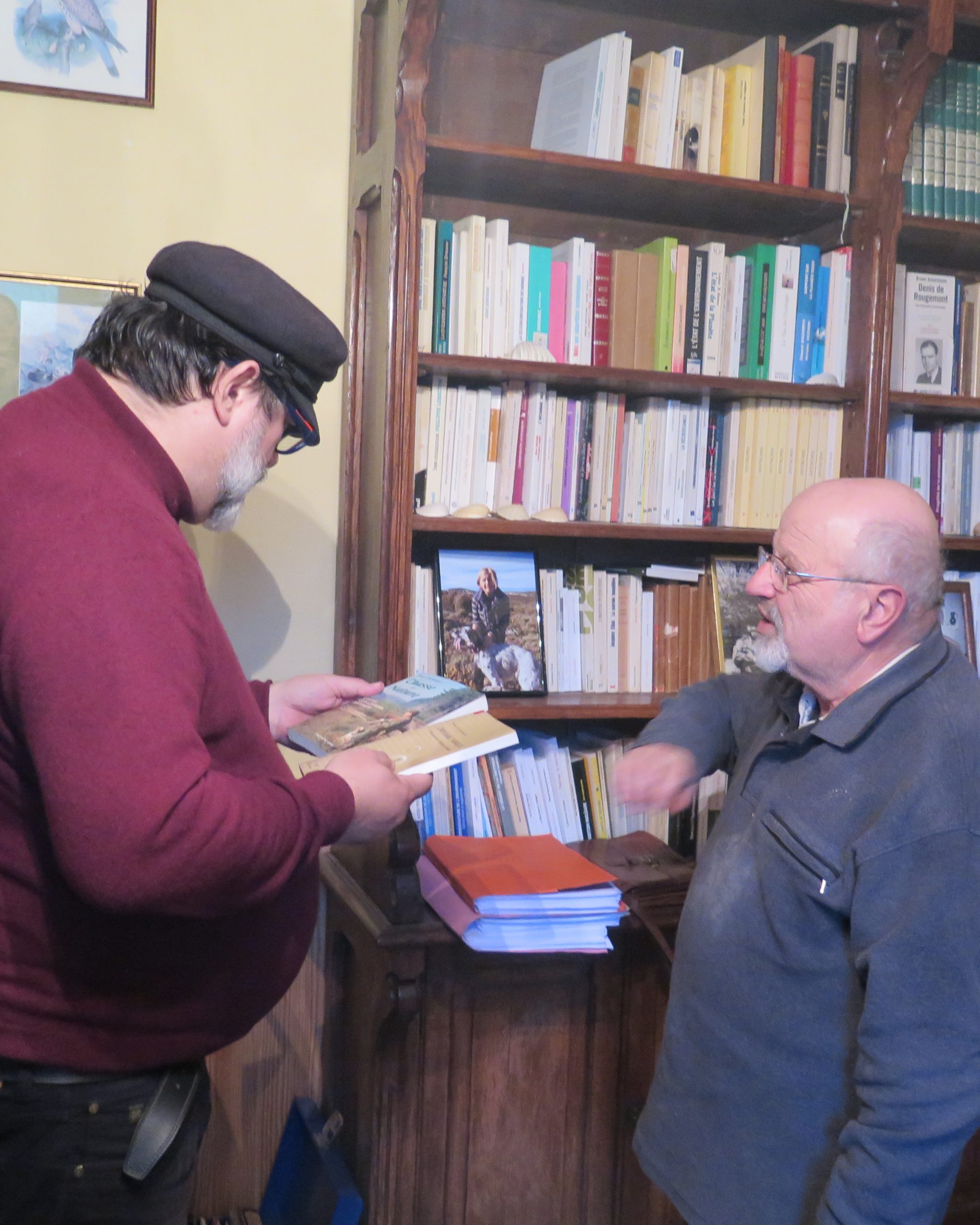 Simon Charbonneau (à droite) et Laurent Gervereau lors de la donation de documents de Bernard Charbonneau et Jacques Ellul à Nuage Vert le 20 février 2018. Ces pièces constituent le fonds qui a permis l’exposition et le livre en 2021 : ELLUL, CHARBONNEAU, ANDRE LOUIS. Trois pionniers de l’écologie en Nouvelle Aquitaine. Rappelons que Nuage Vert a reçu ensuite le 12 septembre 2021 la très importante donation de la fille d’André Louis, Françoise Besset-Louis, sur cet ingénieur agronome qui parle dès 1949 d' »agriculture biologique » et fonde en 1964 Nature & Progrès. Nuage Vert porte les activités d’éveil à ces questions du CALAB (Centre André Louis Pour l’Agriculture Biologique). Ci-dessous, tiré des collections : photo originale de Bernard Charbonneau en 1995 / André Louis faisant cours en pleine nature (1965) / dédicace en 1972 de Jacques Ellul à son ami Bernard Charbonneau