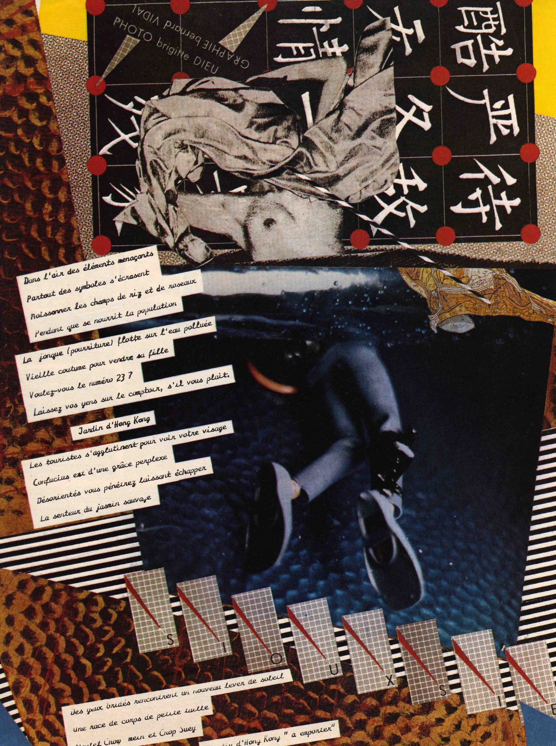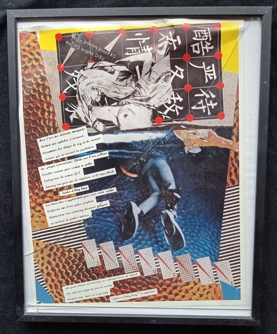 tableau-objet offert à Nuage Vert le 27 février 2026 par Bernard Vidal. Bernard Vidal (Bananar) est un membre actif du groupe BAZOOKA, comme Kiki Picasso, groupe fondé par des élèves de l’école des Beaux-Arts à Paris en 1974 (et qui s’active jusqu’en 1979 et au-delà). BAZOOKA est considéré comme une des traductions visuelles du mouvement PUNK, pratiquant la critique des médias. Cette composition a été réalisée par Vidal-Bananar en 1977-78 pour la chanteuse et compositrice britannique SIOUXSIE (« Hong Kong Garden »). Il s’agit d’une image encadrée au verre cassé