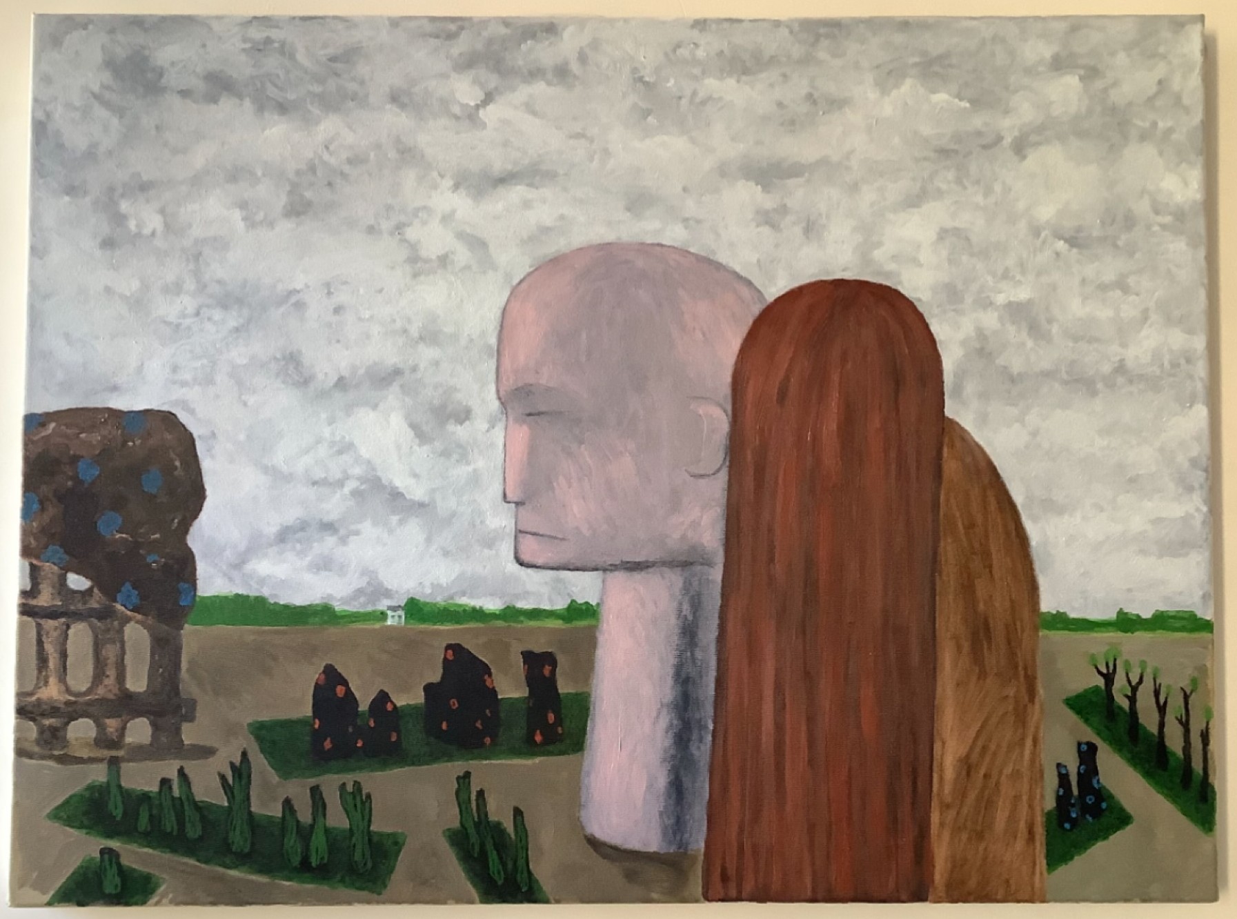 peinture à l’huile sur toile de Bernard Vidal intitulée « Au Jardin II ». Elle fait partie de ces représentations post-apocalyptiques qui sont exposées en 2027 à NUAGE VERT – Centre des Alternatives sous le titre : LES DERNIERS HUMAINS