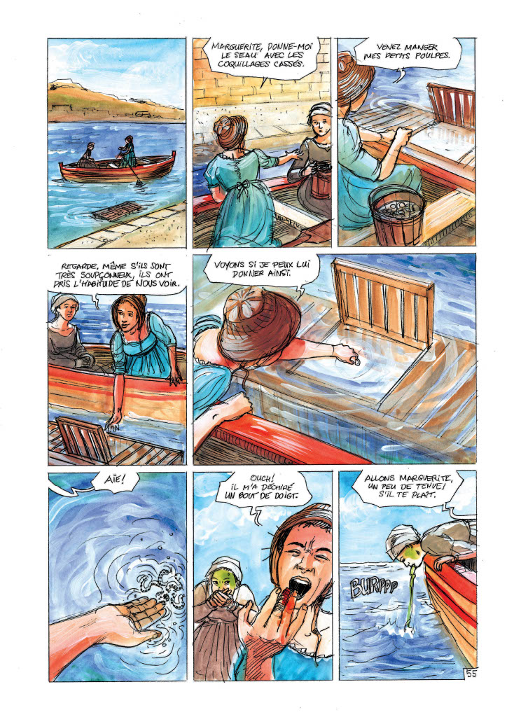 Planche de la bande dessinée de Yannick Lelardoux sur Jeanne Villepreux-Power, pionnière de la biologie marine et qui invente l’aquarium