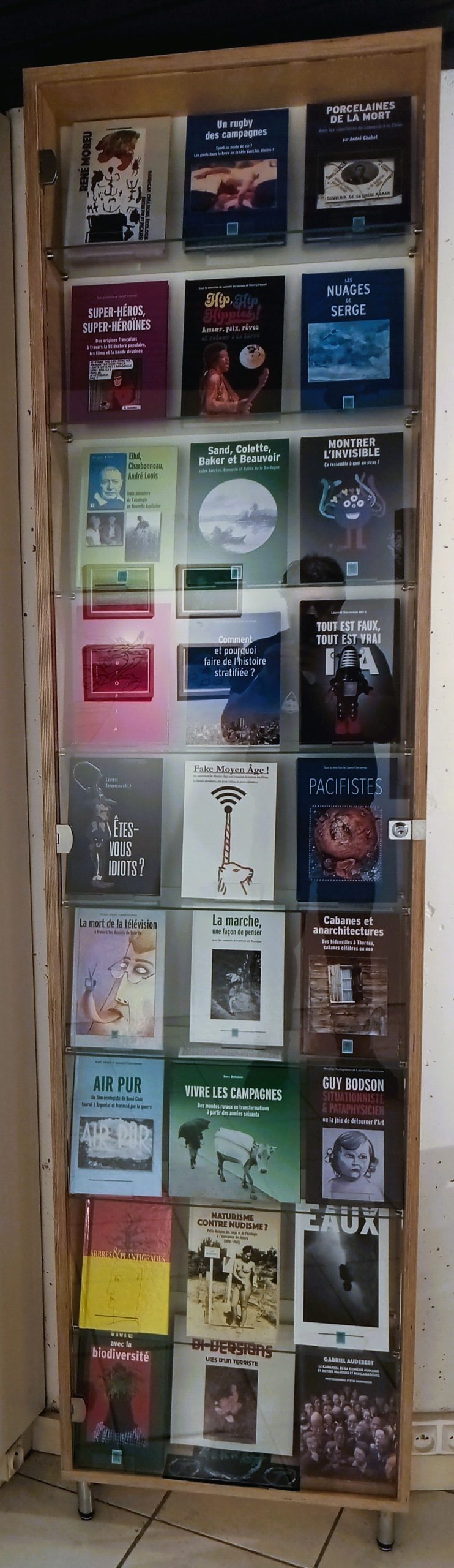 Vitrine permanente de présentation des livres publiés par Nuage Vert dans la galerie NUAGE VERT – Centre des Alternatives (122 rue de Bagnolet Paris 20e)
