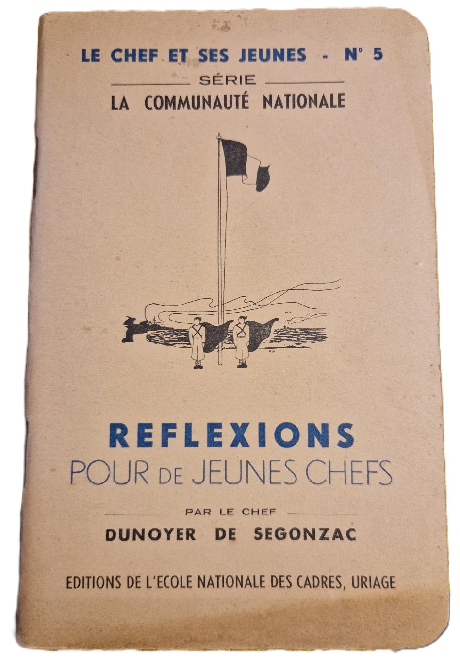 Nuage Vert a rassemblé des collections sur l’Ecole Nationale des Cadres d’Uriage (Isère) car le directeur, Pierre Dunoyer de Segonzac, est venu pendant la guerre à Saint-Léonard-de-Noblat dans le Limousin où sa mère s’était installée et où il avait vécu durant son enfance. Cette école de cadres destinée à former des hauts fonctionnaires (ancêtre de l’ENA), sous l’autorité de l’Etat français mis en place par le maréchal Pétain, est ouverte à des personnalités comme Hubert Beuve-Méry (futur directeur du journal Le Monde), Emmanuel Mounier ou Henry Chombard de Lauwe et des activités très pluridisciplinaires. Fermée en 1943 par Pierre Laval, Dunoyer de Segonzac et ses collaborateurs s’engagent très activement dans la Résistance. Dunoyer de Segonzac est général de brigade dans l’armée de Libération de la France et reçoit en 1946 la médaille de la Résistance française. Francis Lemarque (Nathan Korb de son vrai nom), emprisonné à Aurillac, puis remontant par Tulle, rejoint Dunoyer de Segonzac à Saint-Léonard-de-Noblat (où était interne au collège Serge Gainsbourg sous le nom de Lucien Guimbard). Nuage Vert conserve des pièces autour des réfugiés à Saint Léonard (Kahnweiler, Queneau et son épouse Janine –Kahn de son nom de naissance–, Michel Leiris…). Lemarque est poète, compositeur (notamment pour Yves Montand), chanteur. Il a aidé différents interprètes à leurs débuts, comme Serge Lama à qui il dédicace ses mémoires (ci-dessous). C’est aussi à Uriage que Joffre Dumazedier développe la pratique de l’« entraînement mental » avec Benigno Cacérès (qu’il rencontre en 1942 à Uriage avant de partir tous deux en 1943 dans le maquis du Vercors). Ils fondent Peuple et Culture, initié en 1944 dans le maquis, et dont les statuts sont déposés en 1945 pour développer l’éducation populaire en combinant exercices de la pensée, philosophie, histoire, poésie, théâtre, chant et arts. Ils cherchent à promouvoir des individus libres en rendant « la culture au peuple et le peuple à la culture ». Nuage Vert conserve un fonds de Peuple et Culture en Corrèze (fondé en 1951) avec des publications de Marc Pataut ou Gérard Paris-Clavel ou une bannière originale créée par le collectif d’artistes RADO intervenant de 2011 à 2014 sur la façon dont les réseaux techniques (eau, énergie, information…) façonnent et sont façonnés par le territoire
