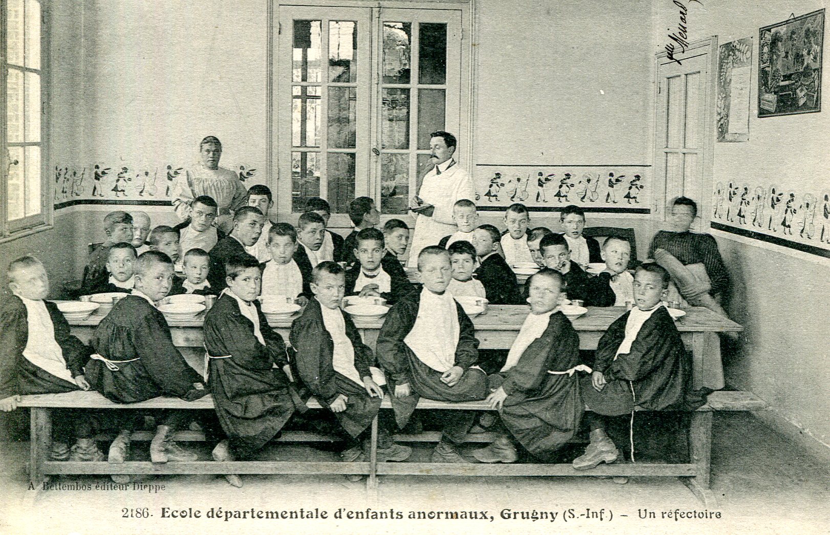 Nuage Vert publie en 2024 Etes-vous idiots ? en partenariat avec la Fondation John Bost. Il s’agit d’une vaste réflexion sur la construction de la notion au sens médical au XIXe siècle et aussi au sens qu’il prend dans la pop culture au XXe siècle. Il s’agit d’une interrogation sur la « normalité » à laquelle participent notamment, pour la partie médicale, Jacques Hochmann, Anne Nardin ou Emmanuel Venet. Mais c’est aussi dans ce livre qu’interviennent Yvan Leclerc autour de Flaubert et la bêtise, Jean-Louis Backès sur L’Idiot de Dostoïevski, Antoine de Baecque et les « crétins des Alpes », François Albera sur « idiotie » au cinéma ou Morgan Labar (Orchestres d’idiots). Cette carte postale de 1910 est un des éléments de la vaste collection rassemblée, qui permet de comprendre ces remises en question