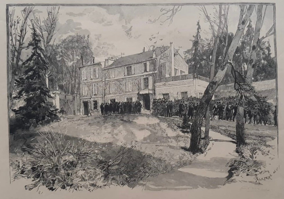 Gravure d’Auguste Lepère (un des promoteurs du renouveau de la gravure sur bois, mort à Domme en Dordogne) signée au crayon, en bas à droite. Il s’agit de la maison des Jardies à Sèvres lors de l’enterrement en 1882 du Cadurcien Léon Gambetta, ardent défenseur de la République. Cela suit un accident d’une balle qui part et le blesse en nettoyant son revolver. Cet accident suscite déjà des polémiques et des « fake news » mettant en cause sa compagne Léonie Léon accusée d’être une espionne au service de l’Allemagne. Ces « canards », fausses nouvelles à scandales, faits divers spectaculaires, sont consubstantiels du développement des feuilles volantes comme de la presse. Ils anticipent notre actuelle guerre mondiale médiatique sur une planète où beaucoup d’humains ont basculé dans un univers où l’indirectement visible (par écran interposé) a pris le pas sur le directement visible. Ce changement complet de perspective dans nos temps multimédiatiques a conduit Nuage Vert à mener des réflexions autour du thème MENTIR EN POLITIQUE (depuis la Préhistoire) dirigées par Laurent Gervereau avec la collaboration de Yohann Chanoir, qui intervient le 18 juillet 2026 pour des échanges publics lors des Evénements « Histoires de Passages… ». Cela s’inscrit dans les actions pour une pédagogie à tous âges : REGARDS CRITIQUES